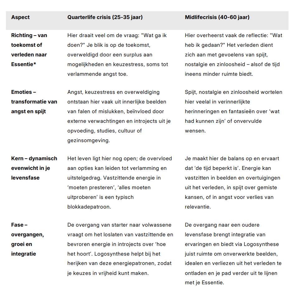 Welke fase je ook doormaakt, je ziet in de onderstaande tabel weergegeven dat Logosynthese een transformerend licht werpt op de onderliggende dynamiek - steeds vanuit het perspectief dat alles energie is. Waar crisis eerst voelt als een blokkade, mag het door de lens van Logosynthese worden gezien als een uitnodiging tot bevrijding van vastzittende en bevroren energie. In de tabel zie je weergegeven hoe Logosynthese in beide levensfasen richting en perspectief geeft.